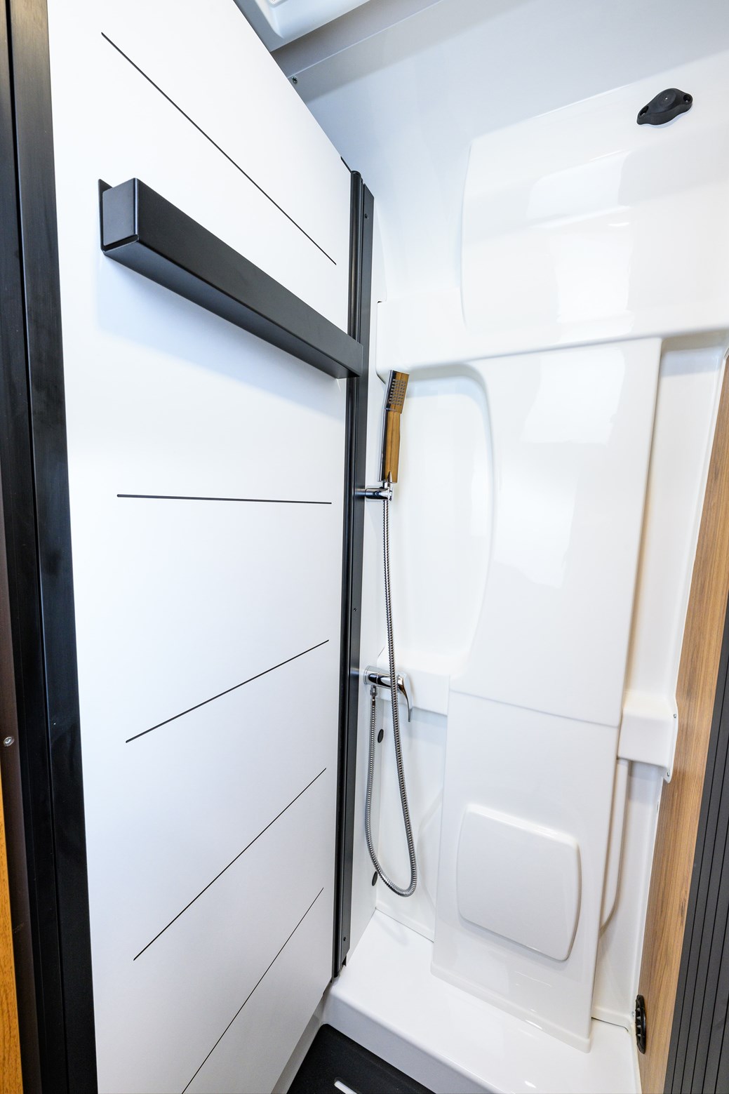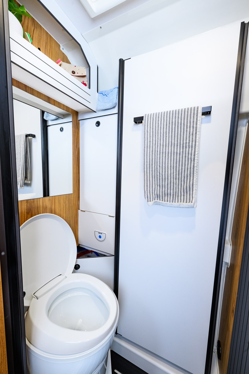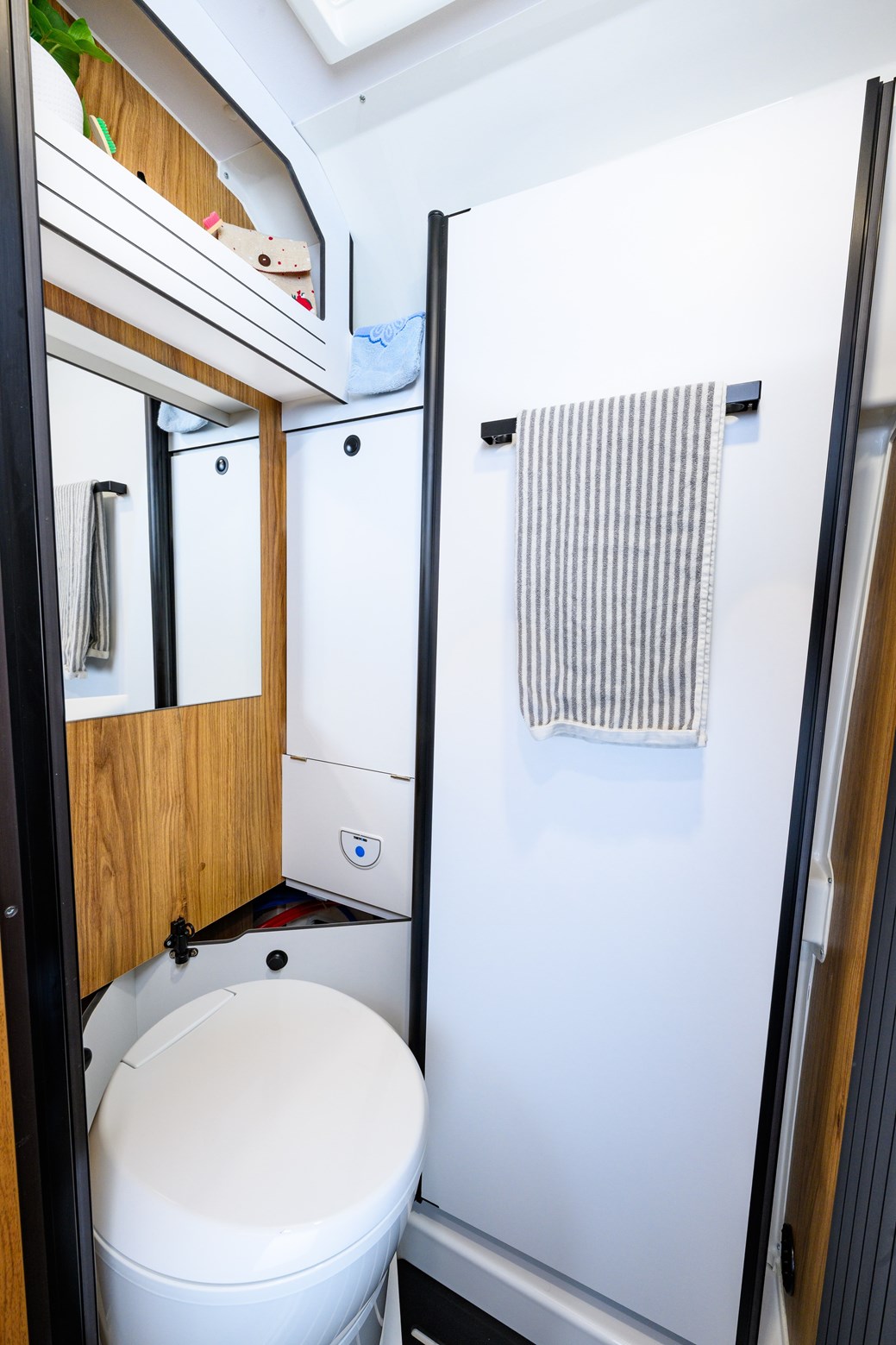Il WC scorrevole e il lavello a scomparsa garantiscono praticità e libertà di movimento, mentre la doccia dalle dimensioni generose, simile a quella di casa, rende l’esperienza a bordo ancora più piacevole. La finestra apribile e il sistema di ventilazione a tetto assicurano luminosità e ricambio d’aria costante, contribuendo al benessere quotidiano durante il viaggio.