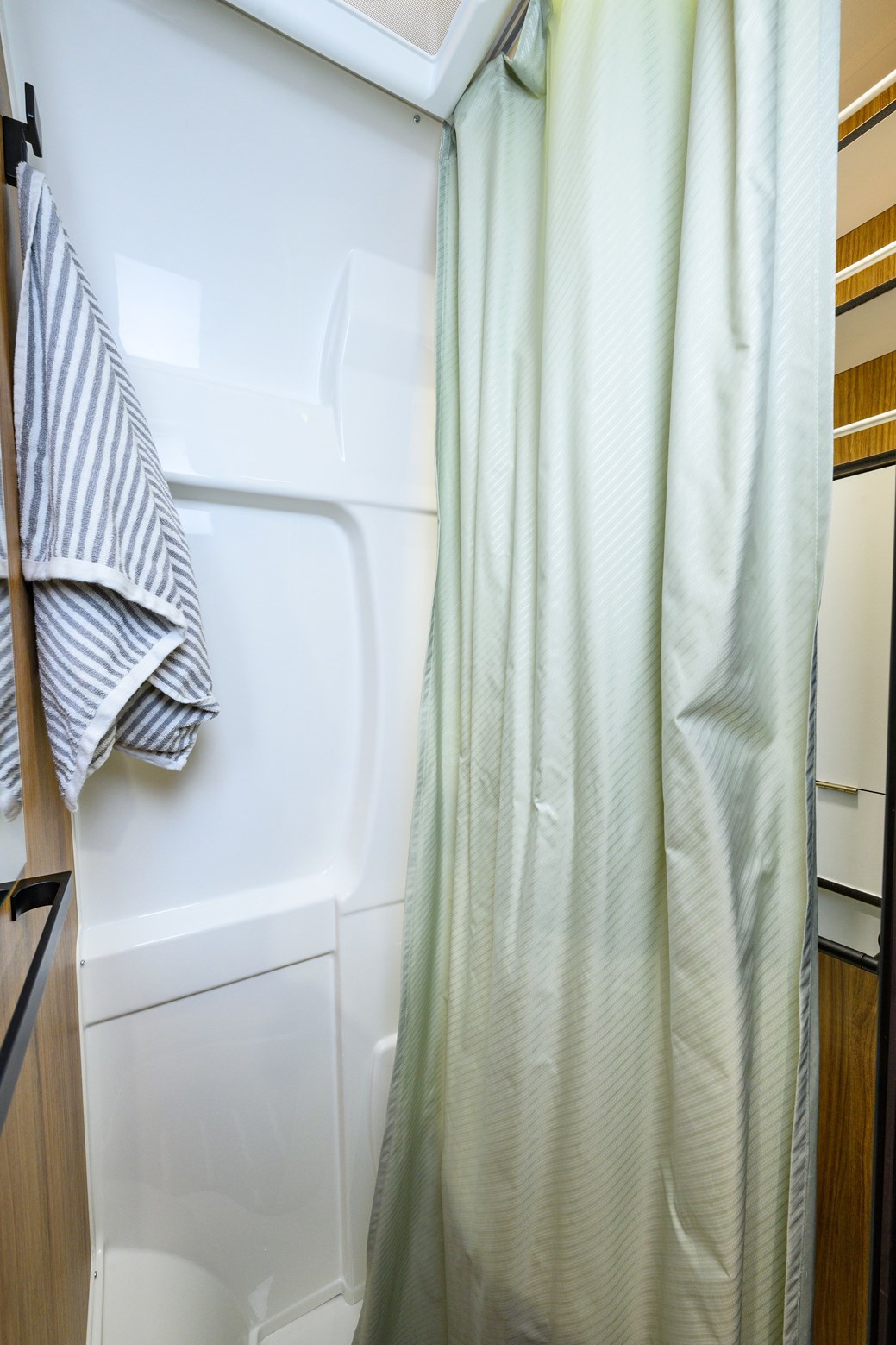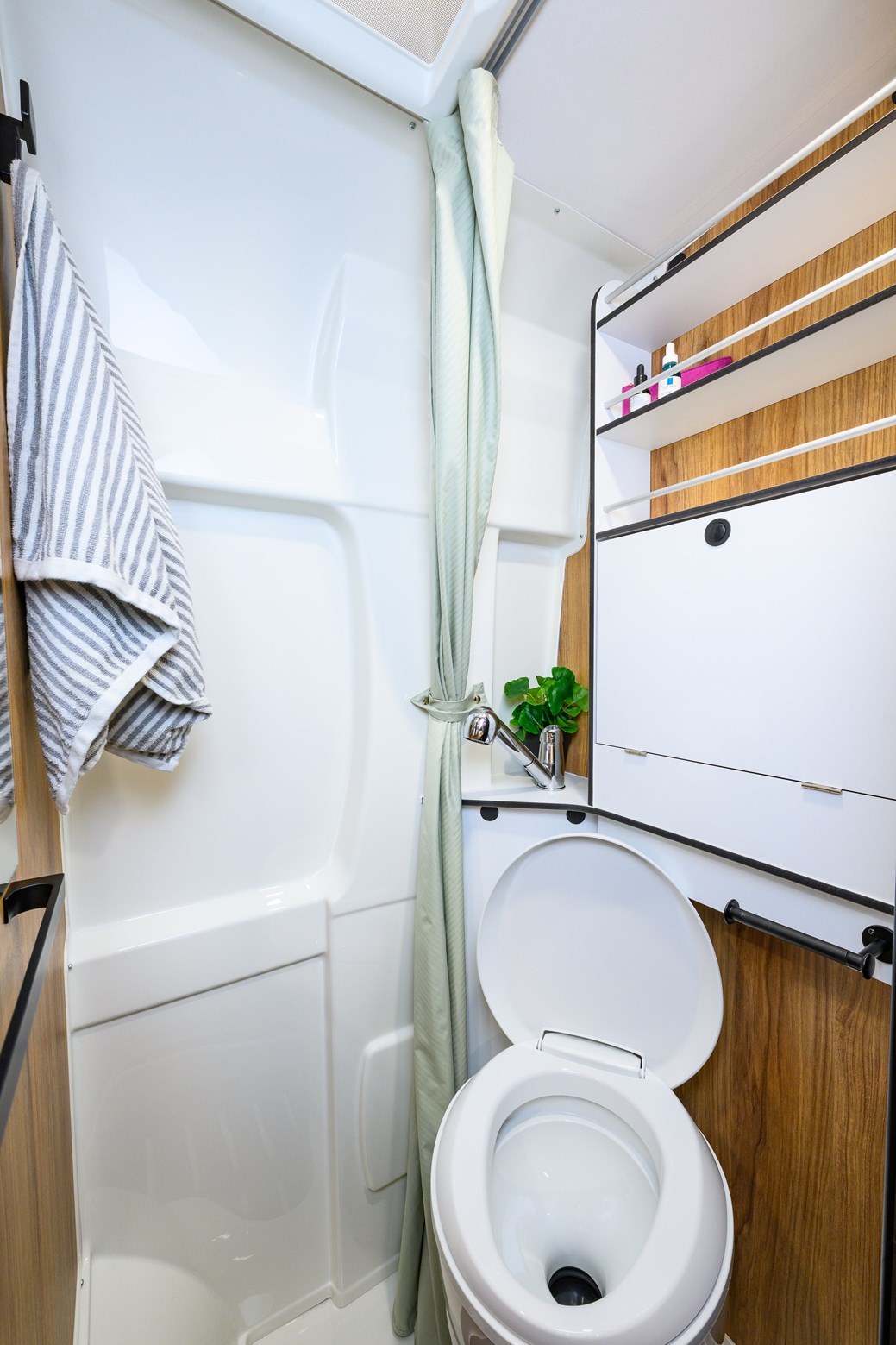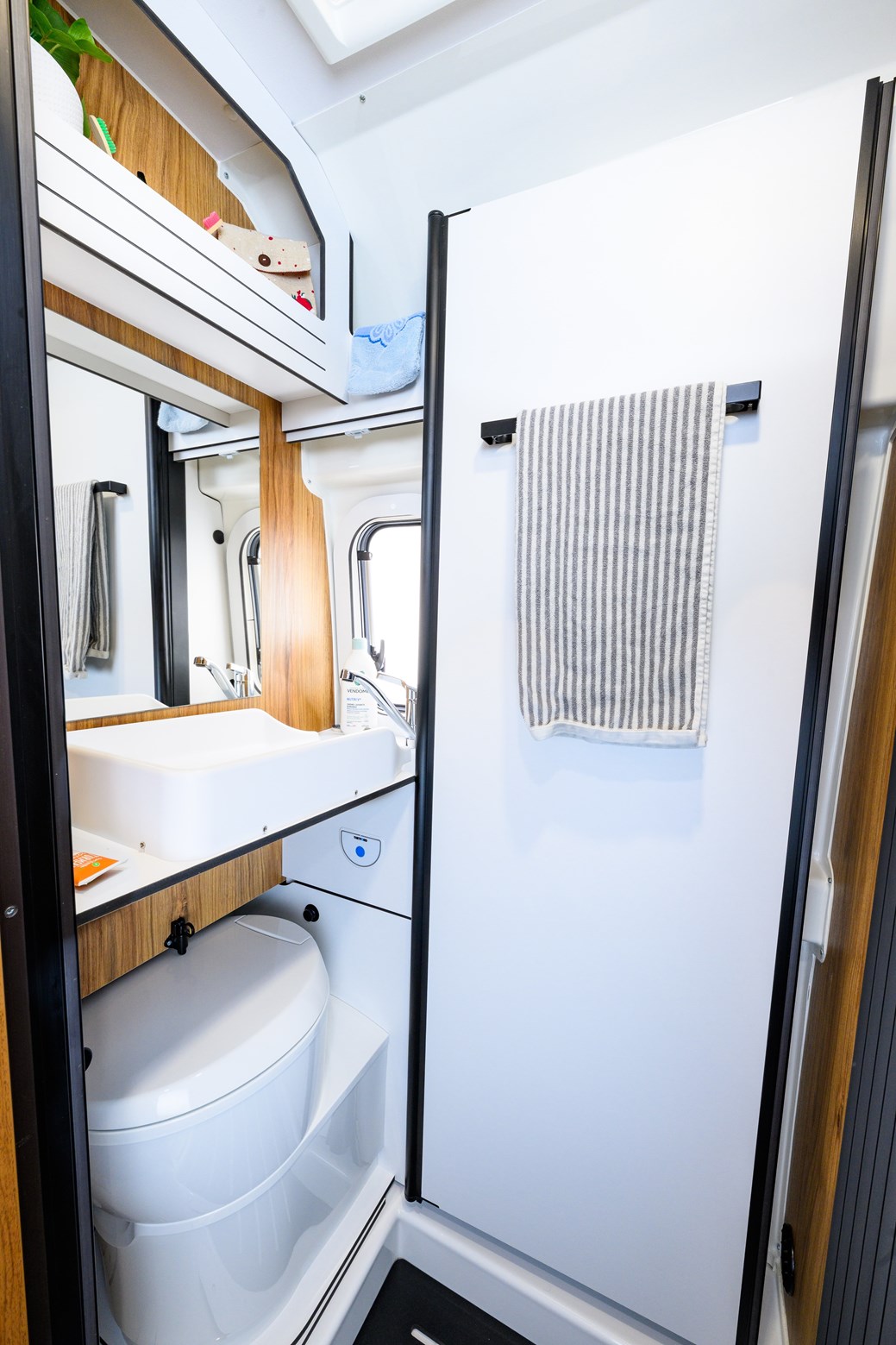 Il WC scorrevole e il lavello a scomparsa garantiscono praticità e libertà di movimento, mentre la doccia dalle dimensioni generose, simile a quella di casa, rende l’esperienza a bordo ancora più piacevole. La finestra apribile e il sistema di ventilazione a tetto assicurano luminosità e ricambio d’aria costante, contribuendo al benessere quotidiano durante il viaggio.