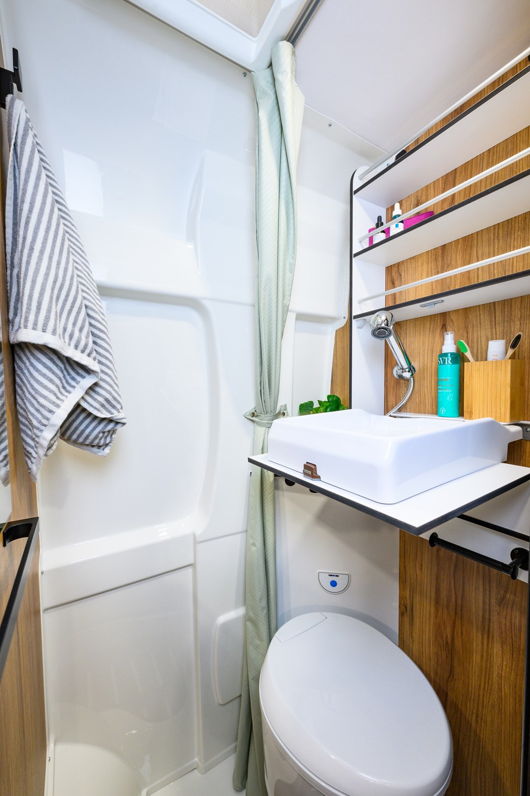 La zona bagno dei van Font Vendôme combina funzionalità e comfort, trasformando ogni spazio in un ambiente pratico e accogliente, ideale per vivere al meglio ogni viaggio.